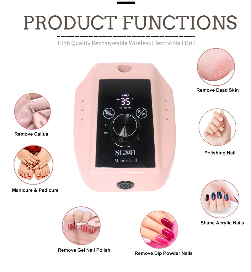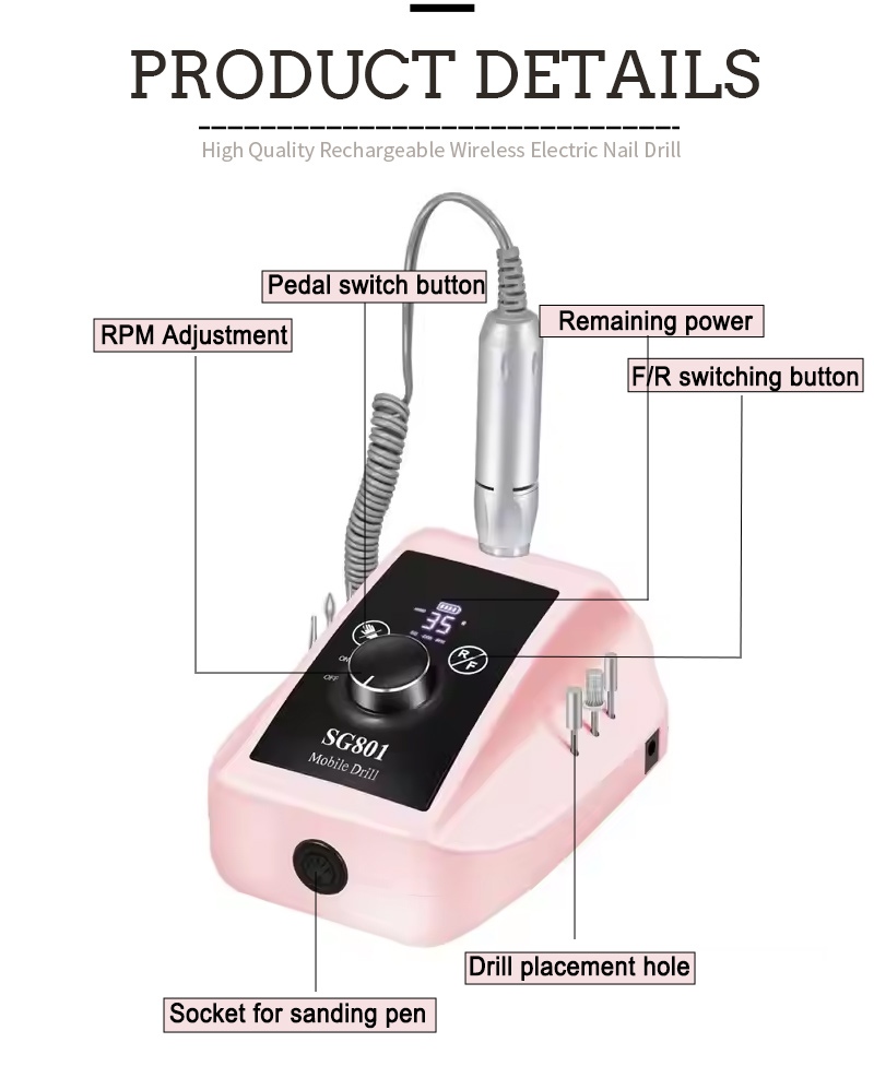 Šio 35 000 aps./min elektrinio nešiojamojo gelinio nagų grąžto ekrano dizainas turi įjungimo / išjungimo jungiklį ir sukimąsi pirmyn / atgal, kad iš viso aktyvuotų vienu mygtuku, greito įkrovimo lizdas apačioje, keičiamas gręžimo lizdas viršuje ir trijų padėčių reguliuojamas greitis, kad atitiktų įvairius poreikius.