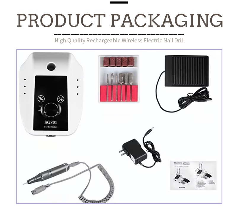 Šioje 35 000 aps./min elektrinio nešiojamojo gelinio nagų grąžto pakuotėje yra šlifavimo rašiklio gaminys, USB įkrovimo laidas, gaminio naudojimo instrukcija ir lengva bei nešiojama dėžutė.