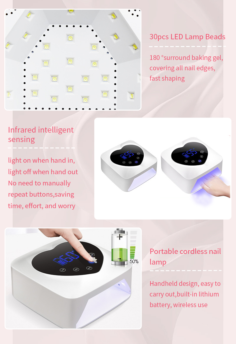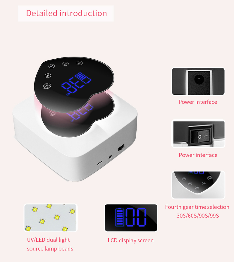 Produktas užtikrina tolygų klijų džiūvimą be susitraukimo. Dvigubi šviesos šaltiniai švelniai šildo, kad nepakeistų rankų spalva ir nepatemptų akys, tinka tiek rankoms, tiek kojoms, o tai užtikrina nepaprastai greitą džiūvimą.