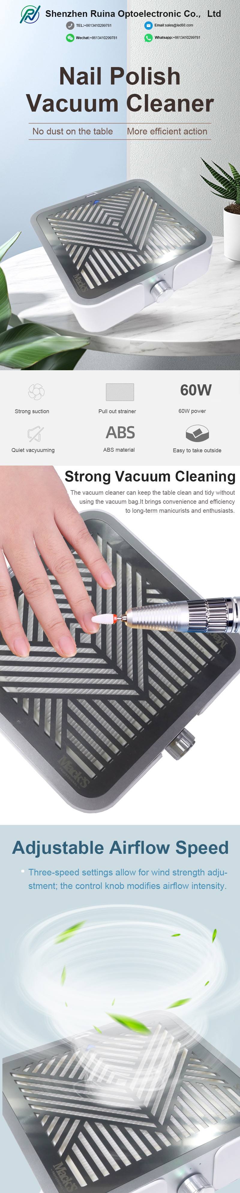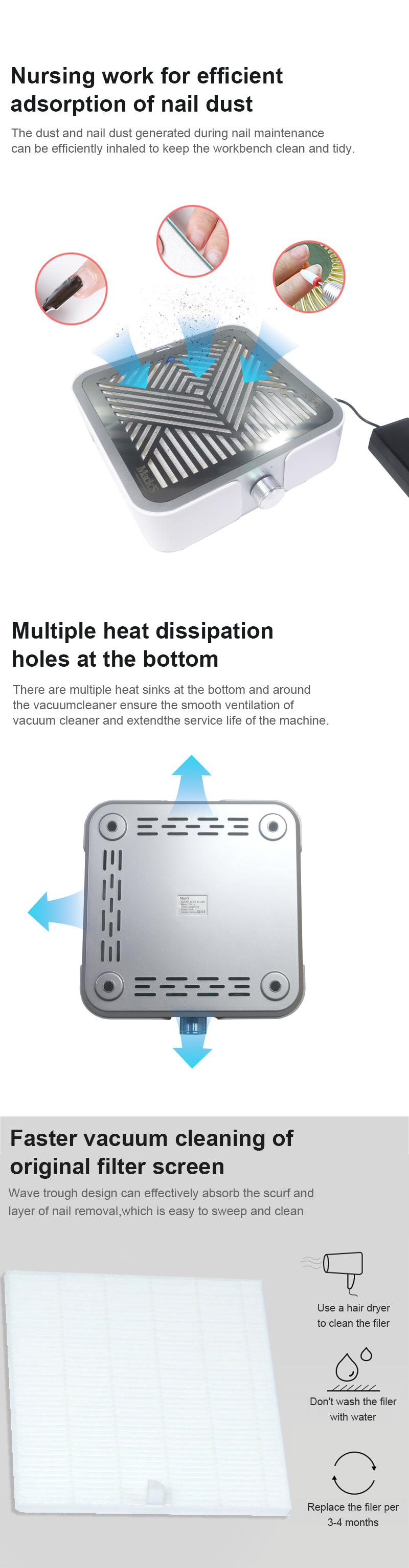 Produktai, stipriai adsorbuojantys nagų šiukšles, nepraleidžia dulkių, išlaiko stalviršį švarų ir tvarkingą, greitas siurbimas nepraleidžia dulkių, didelė galia yra efektyvesnė.