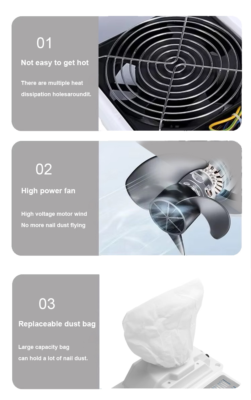 TheStalinis įtaisytas nagų dulkių surinkėjas yra įmontuotas dulkių nusiurbimo įrenginys, skirtas montuoti tiesiai į salono darbo vietą. Skirtingai nuo nešiojamų įrenginių, kurie sėdi ant stalo, šis įtaisytasis modelis sukuria vientisą, netvarkingą darbo vietą. Jis sulaiko akrilo ir gelio dulkes šaltinio metu, kai atliekamos padavimo ir formavimo paslaugos, neleisdamas ore esančioms dalelėms nusėsti ant paviršių arba technikų ir klientų įkvėpti.