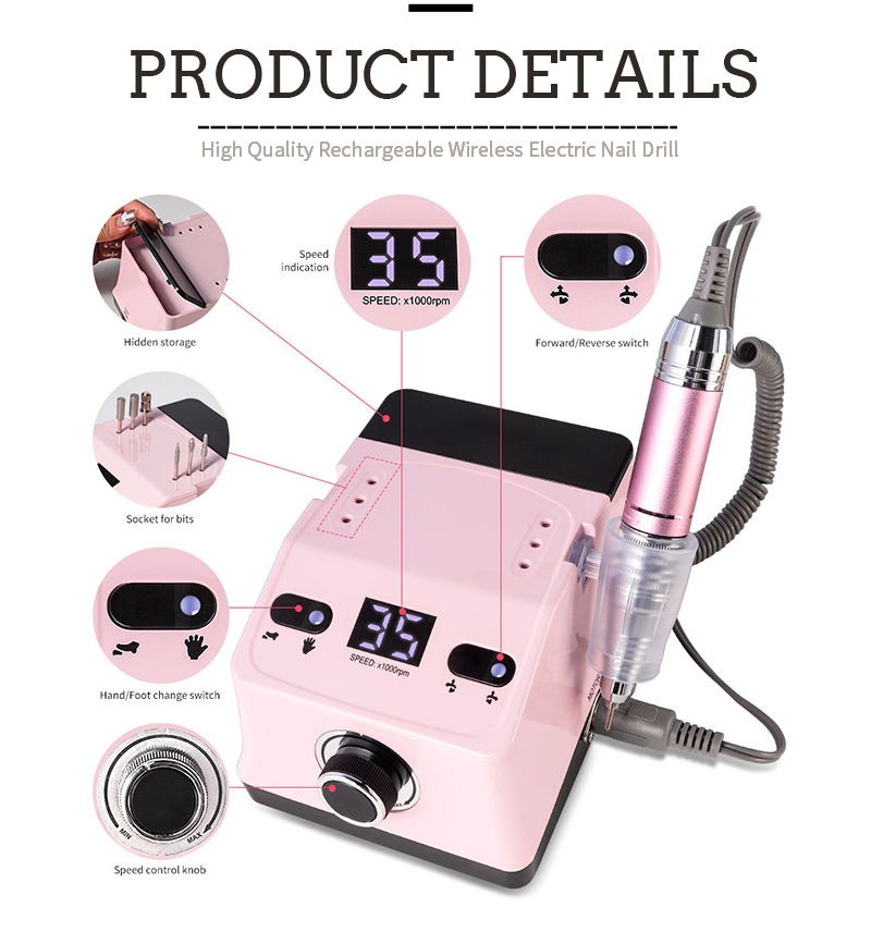 Šio rankinio nagų grąžto ir poliravimo aparato ekrano dizainas turi įjungimo/išjungimo jungiklį ir sukimąsi pirmyn/atgal, kad iš viso aktyvuotų vienu mygtuku, greito įkrovimo lizdas apačioje, keičiamas gręžimo lizdas viršuje ir trijų padėčių reguliuojamas greitis, kad atitiktų įvairius poreikius.