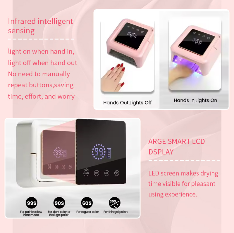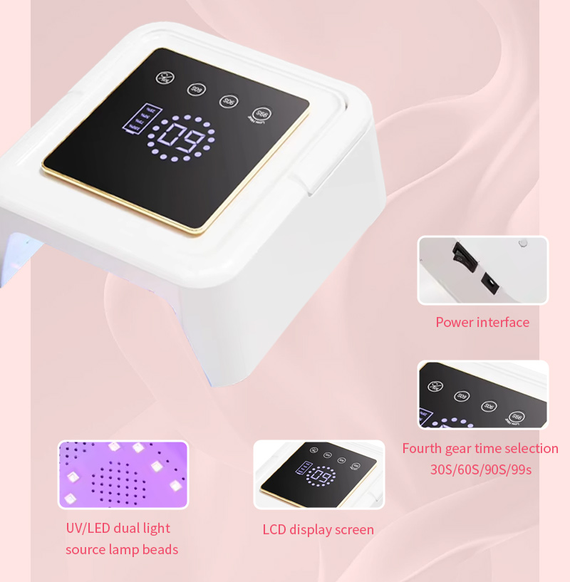 Ši aukštos kokybės gelinio nagų lako greitai džiūstanti lempa užtikrina tolygų klijų džiūvimą be susitraukimo. Dvigubi šviesos šaltiniai švelniai šildo, kad nepakeistų rankų spalva ir nepatemptų akys, tinka tiek rankoms, tiek kojoms, o tai užtikrina nepaprastai greitą džiūvimą.