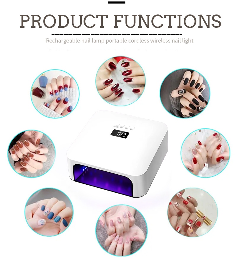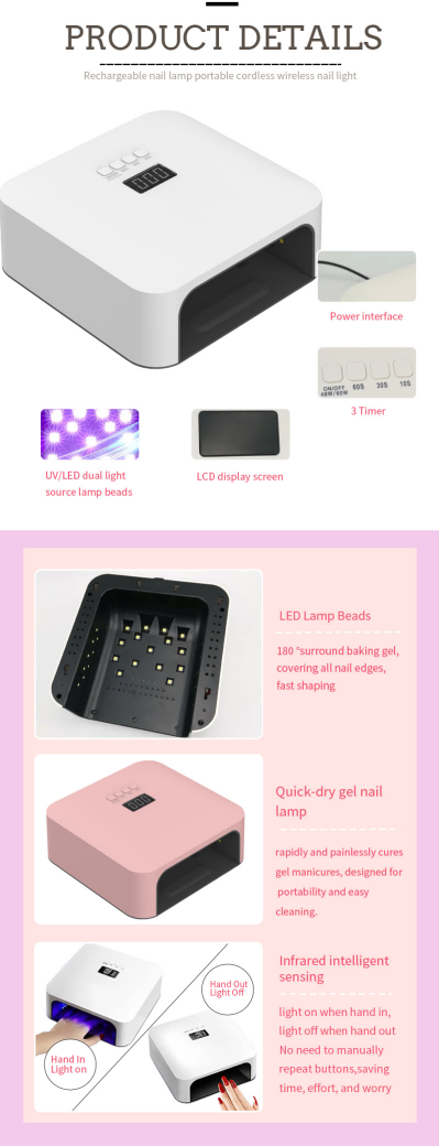 Aukštos kokybės greito nagų džiovinimo lempa užtikrina tolygų klijų džiūvimą be susitraukimo. Dvigubi šviesos šaltiniai švelniai šildo, kad nepakeistų rankų spalva ir nepatemptų akys, tinka tiek rankoms, tiek kojoms, o tai užtikrina nepaprastai greitą džiūvimą.