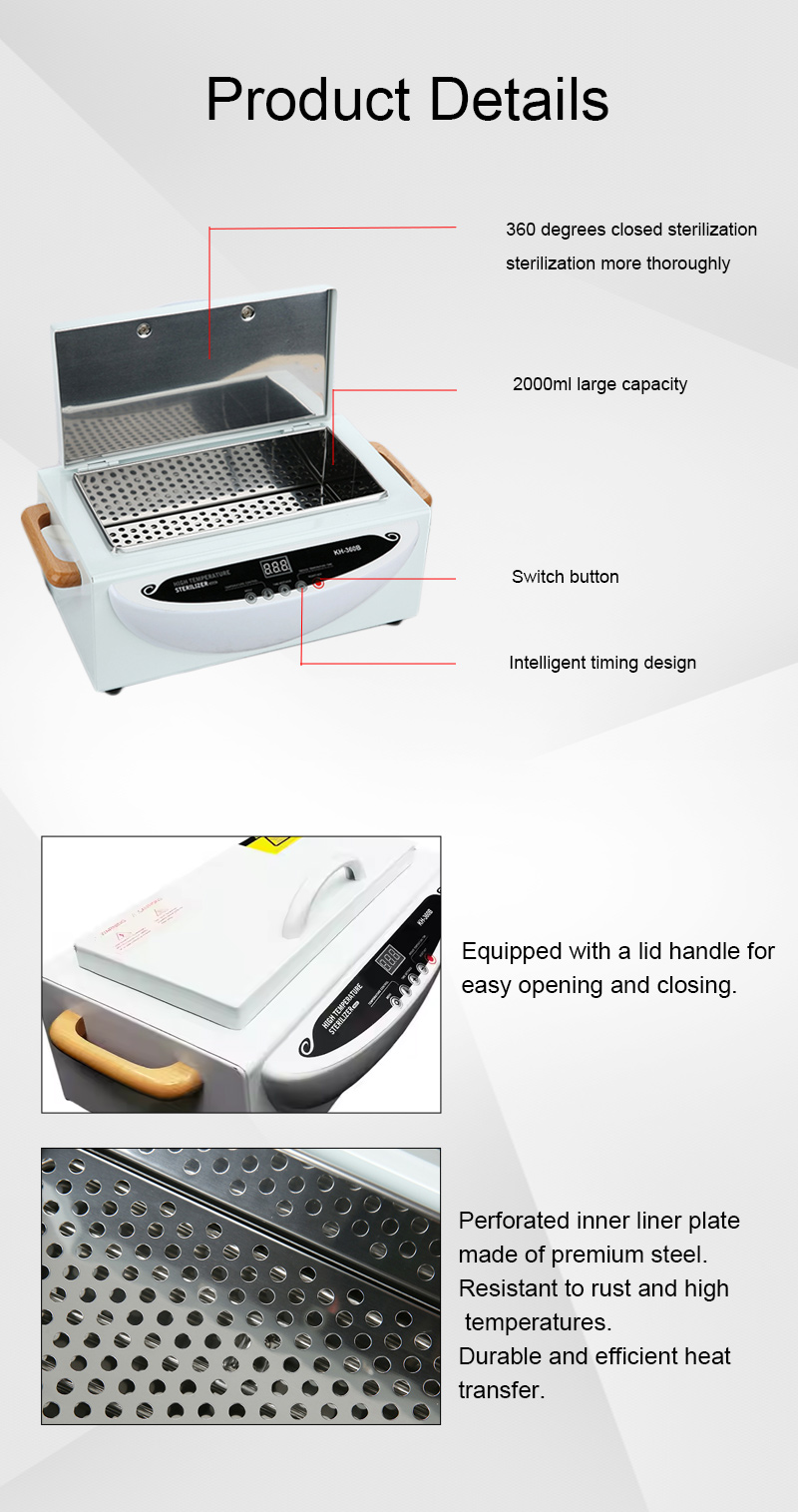 Šis sterilizatorius pirmiausia generuoja šilumą per šildymo žiedą, naudodamas aukštą temperatūrą dezinfekcijai.