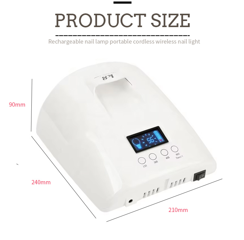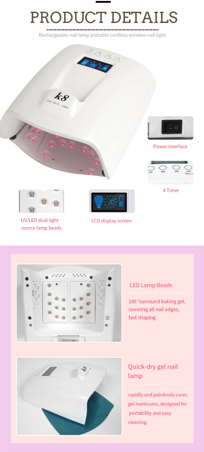 Didelės talpos nagų džiovinimo lempa su rankena užtikrina tolygų klijų džiūvimą be susitraukimo. Dvigubi šviesos šaltiniai švelniai šildo, kad nepakeistų rankų spalva ir nepatemptų akys, tinka tiek rankoms, tiek kojoms, o tai užtikrina nepaprastai greitą džiūvimą.