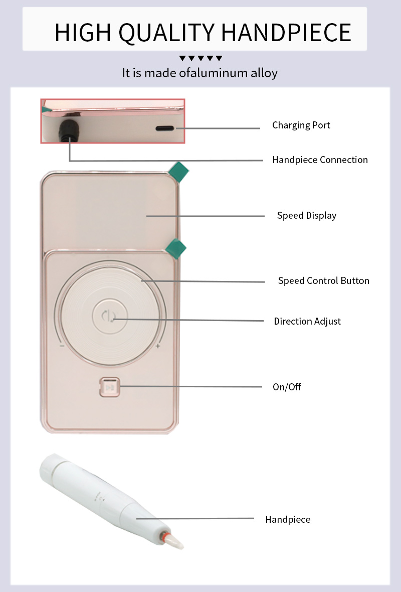 Šis didelio greičio ir mažo triukšmo šlifavimo rašiklio ekranas su šlifavimo rašiklio lizdu, skystųjų kristalų skystųjų kristalų ekranas gali rodyti apsisukimų skaičių / galią / kryptį, greičio jungiklio rankenėlę, pagal laikrodžio rodyklę / prieš laikrodžio rodyklę perjungimo mygtukas, pauzės mygtukas, 30 000 aps./min. profesionalus variklis, įsukama šlifavimo galvutė.