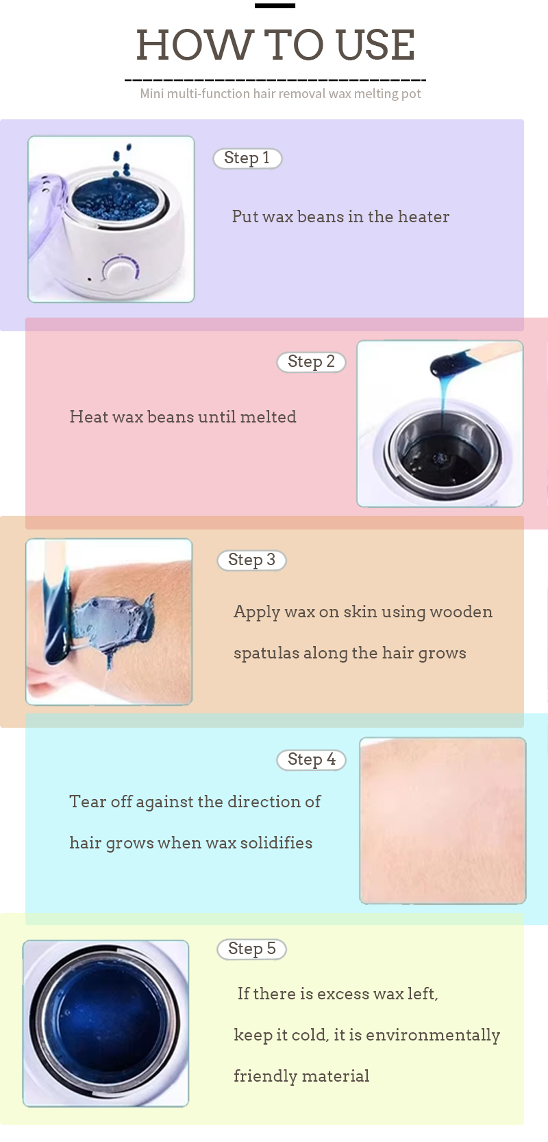 Produkto depiliacinio vaško veikimo būdas, kuo aukštesnė temperatūra tuo greičiau tirpsta vaškas, kuo žemesnė temperatūra tuo lėčiau tirpsta vaškas, pirmiausia supilkite į atitinkamą kiekį depiliacinio vaško pupelių, kaitinkite, kol vaško pupelės išsilydys, tada depiliacinės dalys tolygiai padengto depiliacinio vaško ir galiausiai prieš plaukelių augimo kryptį nuplyšta.