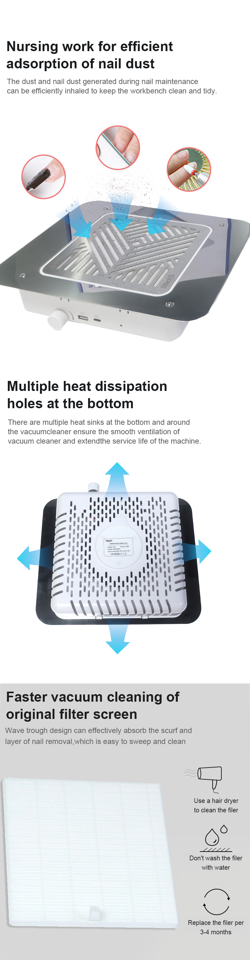 Produktai, stipriai adsorbuojantys nagų šiukšles, nepraleidžia dulkių, išlaiko stalviršį švarų ir tvarkingą, greitas siurbimas nepraleidžia dulkių, didelė galia yra efektyvesnė.