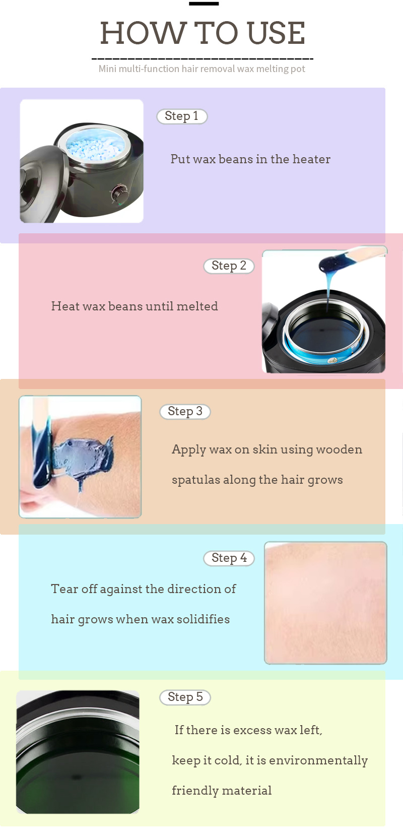 Produkto depiliacinio vaško veikimo būdas, kuo aukštesnė temperatūra tuo greičiau tirpsta vaškas, kuo žemesnė temperatūra tuo lėčiau tirpsta vaškas, pirmiausia supilkite į atitinkamą kiekį depiliacinio vaško pupelių, kaitinkite, kol vaško pupelės išsilydys, tada depiliacinės dalys tolygiai padengto depiliacinio vaško ir galiausiai prieš plaukelių augimo kryptį nuplyšta.