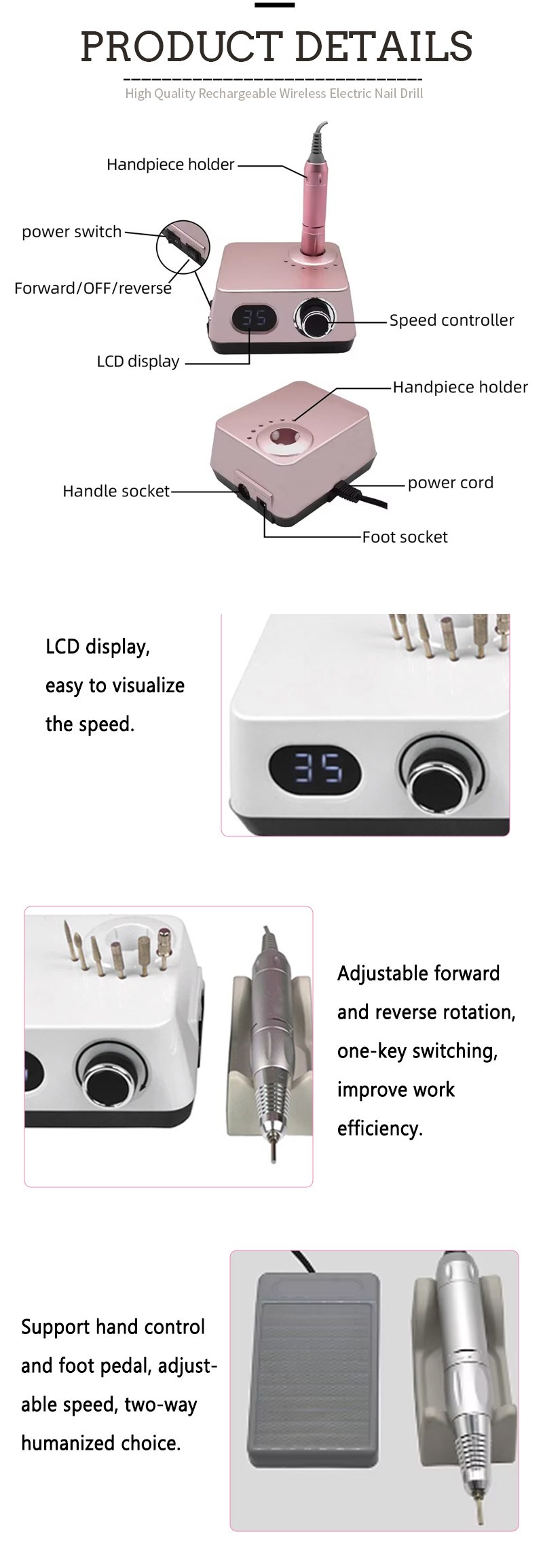 Šio belaidžio elektrinio nagų gręžtuvo ekrano dizainas su 35 000 aps./min. turi įjungimo/išjungimo jungiklį ir sukimąsi pirmyn/atgal, kad iš viso būtų galima aktyvuoti vienu mygtuku, greito įkrovimo lizdą apačioje, keičiamą gręžimo lizdą viršuje ir trijų padėčių reguliuojamą greitį, kad atitiktų įvairius poreikius.